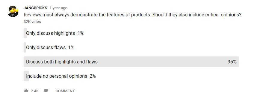 The above poll results from the Community tab on my YouTube channel seem pretty dang conclusive to me. So how come whenever I dislike absolutely anything in a review, I receive a strongly negative viewer reaction, accusing me of being shamefully ungrateful and completely lacking the brainpower and life experience to understand the material and the decisions made by product designers? Why is my opinion so often seen as an effrontery if it isn't 100% positive?