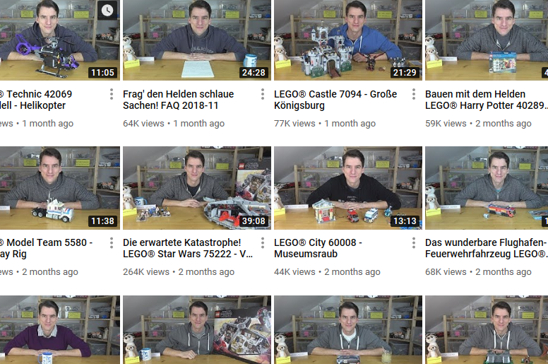 So on YouTube there is this guy. This guy has this face. This face is in every thumbnail. It's always the same. He has an alias, and when you put it into Google Translate it comes out "Hero of the Stones." Stones? I get the feeling it's one of those transliteration vs. translation situations, and what's really intended is "Hero of the Bricks," for aside from specializing in miniatur-gesichtsbilder, he does a whole lot of LEGO stuff.